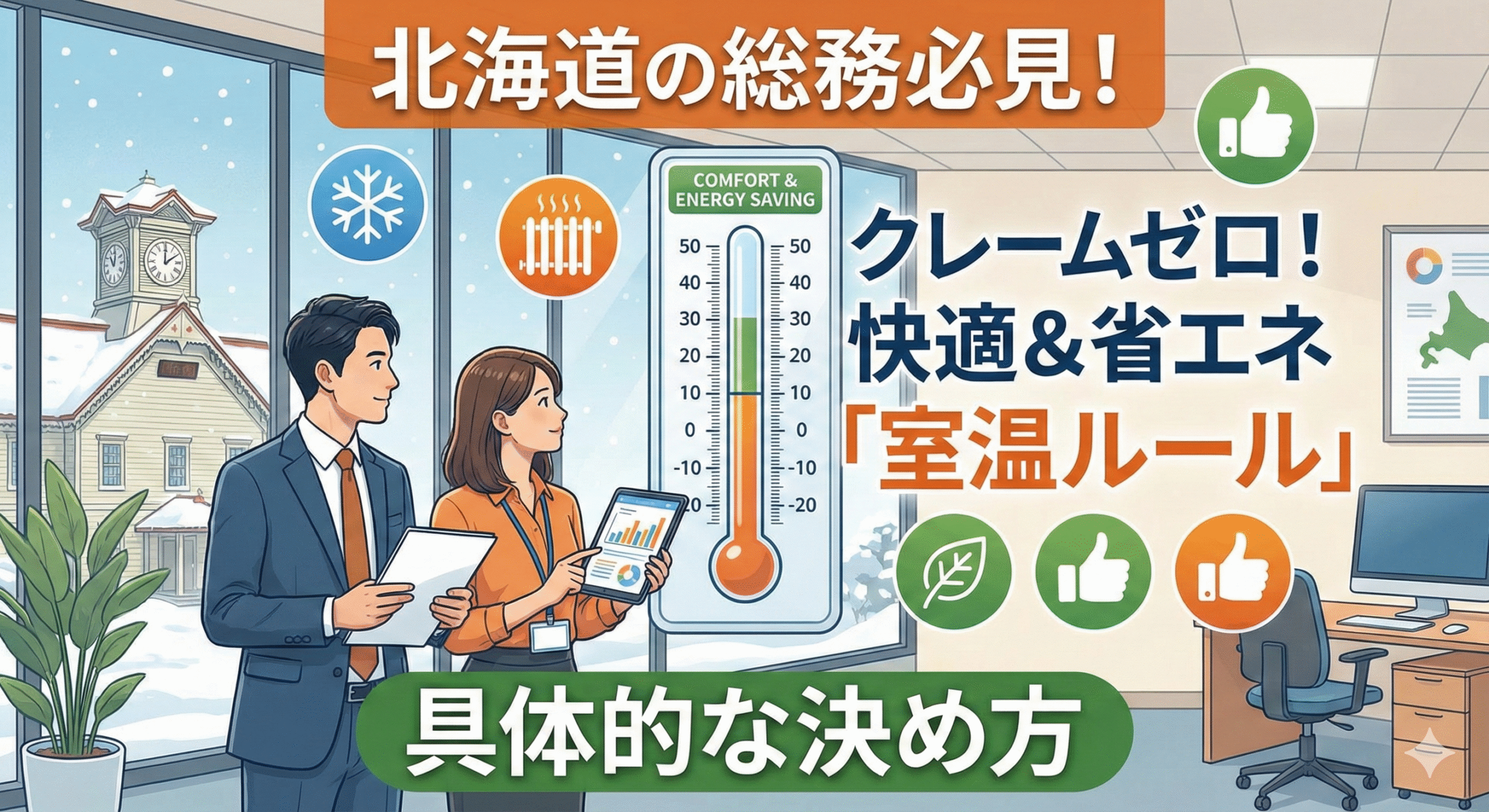 本記事では、北海道のオフィスにおける「室温ルール」の決め方と、省エネ対策について解説しました。 重要なポイントを振り返ります。