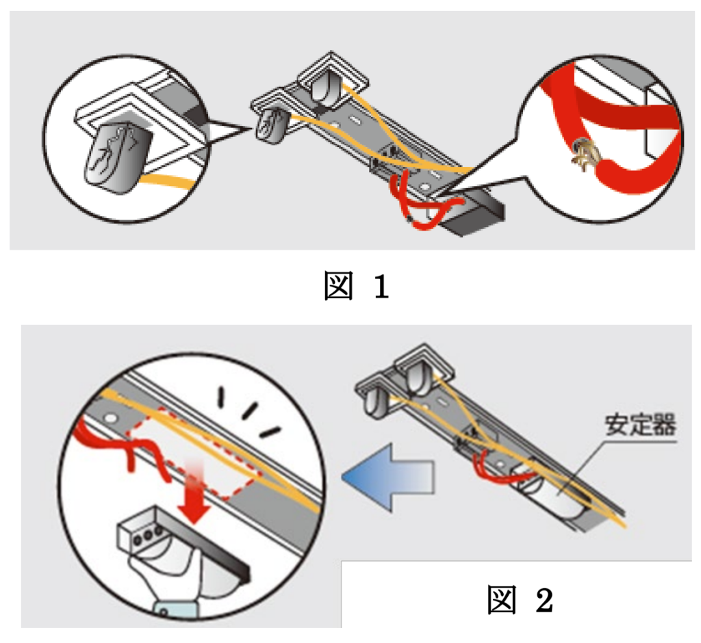 一方、LEDは仕組みが違い、安定器が不要です。だから、器具側に安定器が残ったままだと、