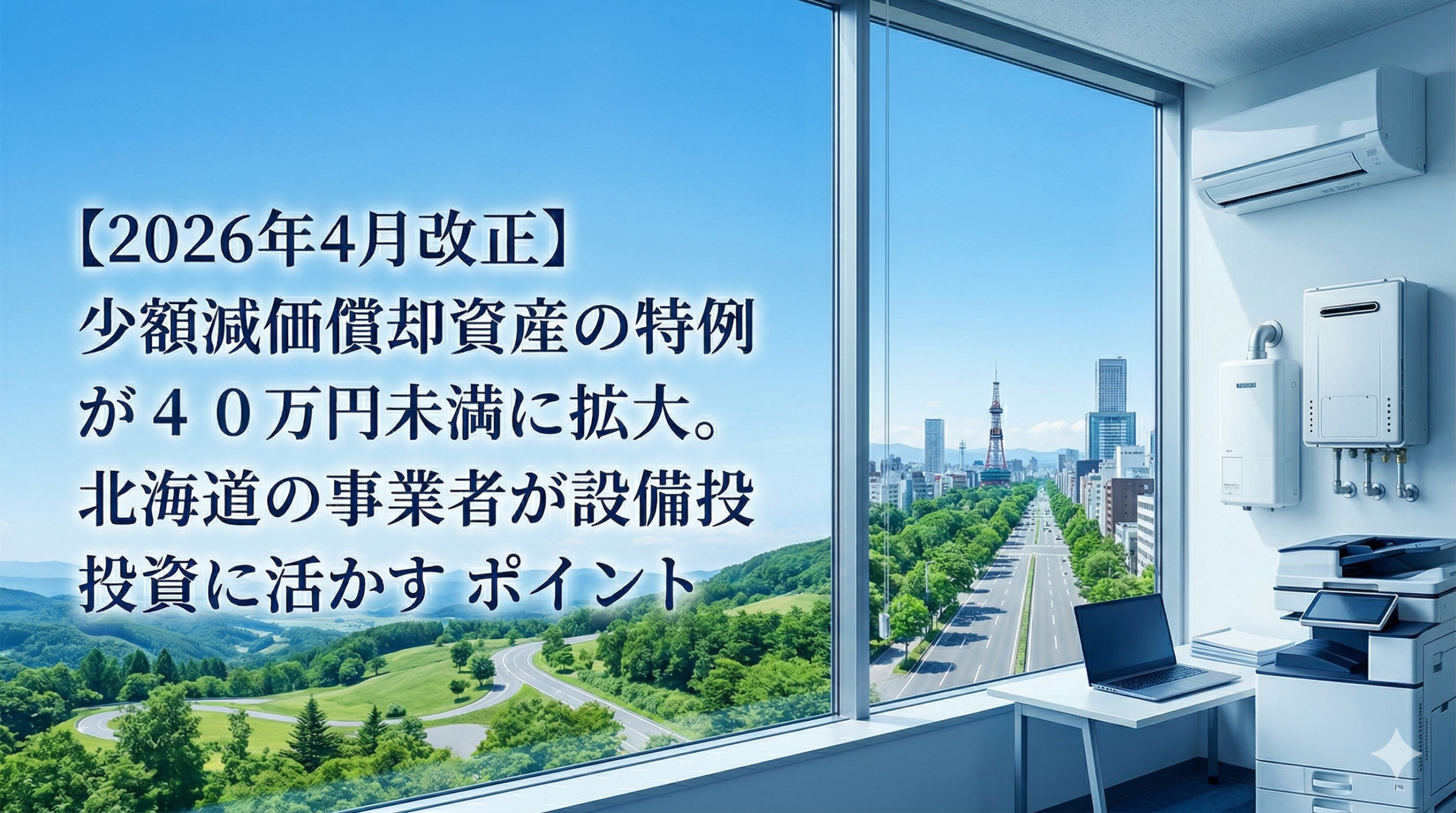 「事務所のエアコンが古くなったが、交換費用を何年もかけて減価償却するのは面倒」「店舗の給湯器を更新したいが、今期の経費で一括処理できないだろうか」。こうした悩みを抱えている北海道の事業者は少なくないはずです。