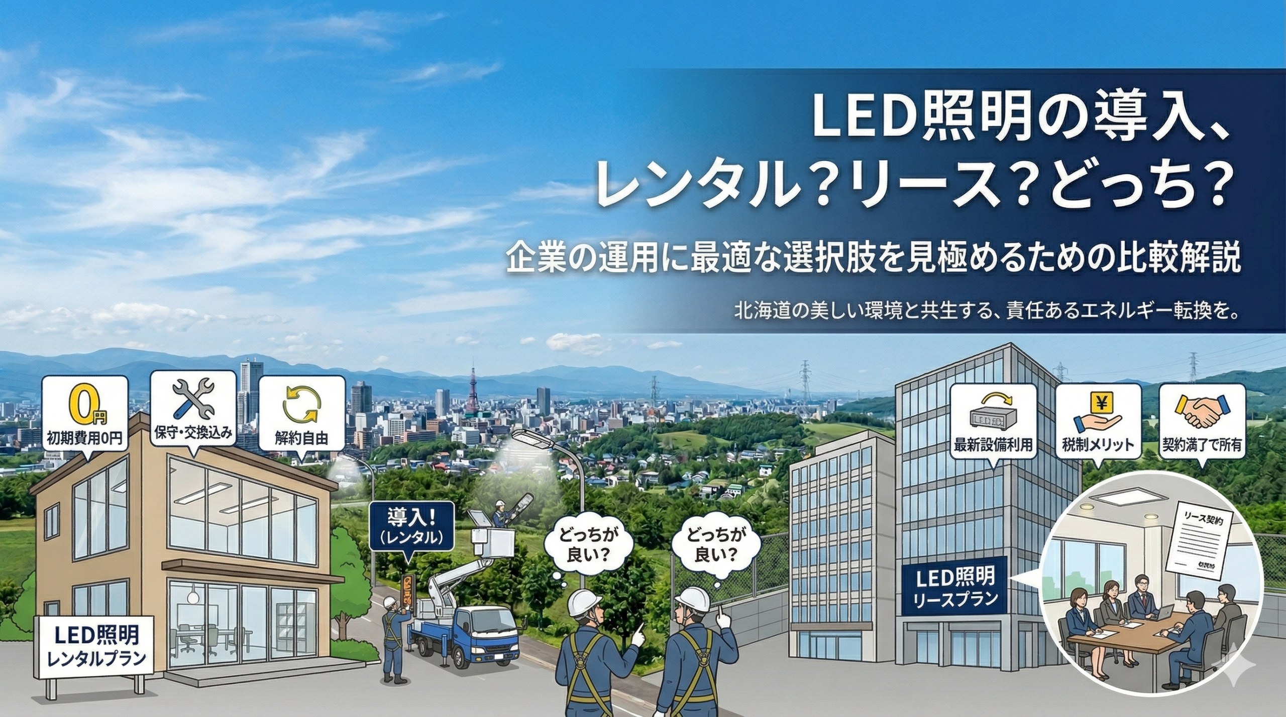 「LED照明に切り替えたいけど、まとまった費用がない…」。北海道で事業を営む経営者や施設管理者の方から、よくこのようなお声をいただきます。LED照明の導入には一括購入だけでなく、「リース」や「レンタル」で初期費用を抑える方法もあります。